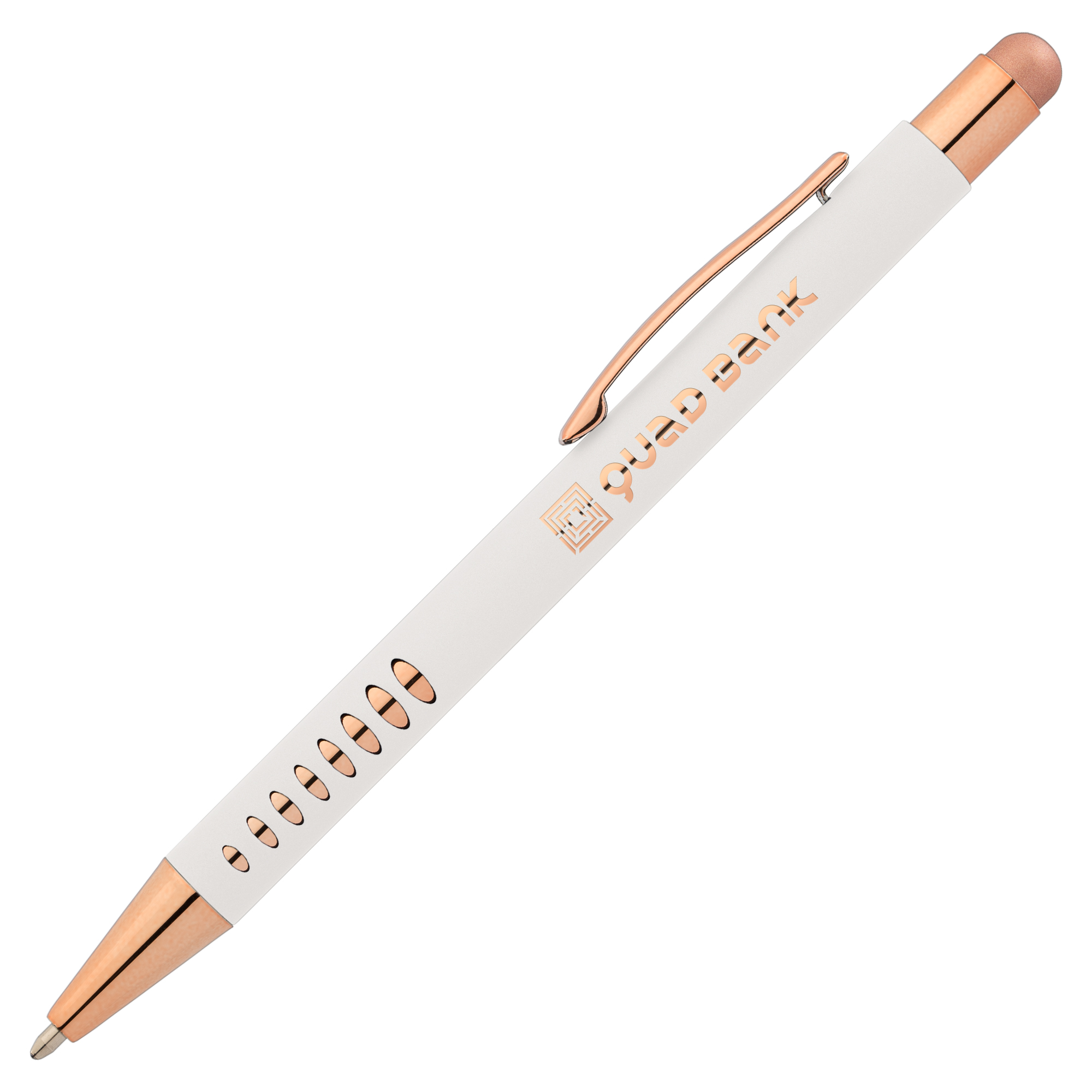 Der Kugelschreiber „Modern Gold“ ist eine perfekte Mischung aus Stil und Funktion. Dieser mit Präzision gefertigte Kugelschreiber verfügt über einen Aluminiumschaft mit Aussparungen, die einen fesselnden roségoldenen Akzent setzen. Die matte Gummi-Oberfläche sorgt für Komfort, während roségoldene Akzente mit Hochglanzoberfläche an Spitze, Kolben und Clip eine luxuriöse Ästhetik schaffen. Dieser Kugelschreiber ist sowohl ausgewogen als auch schlank und sorgt für ein zuverlässiges Schreiberlebnis.